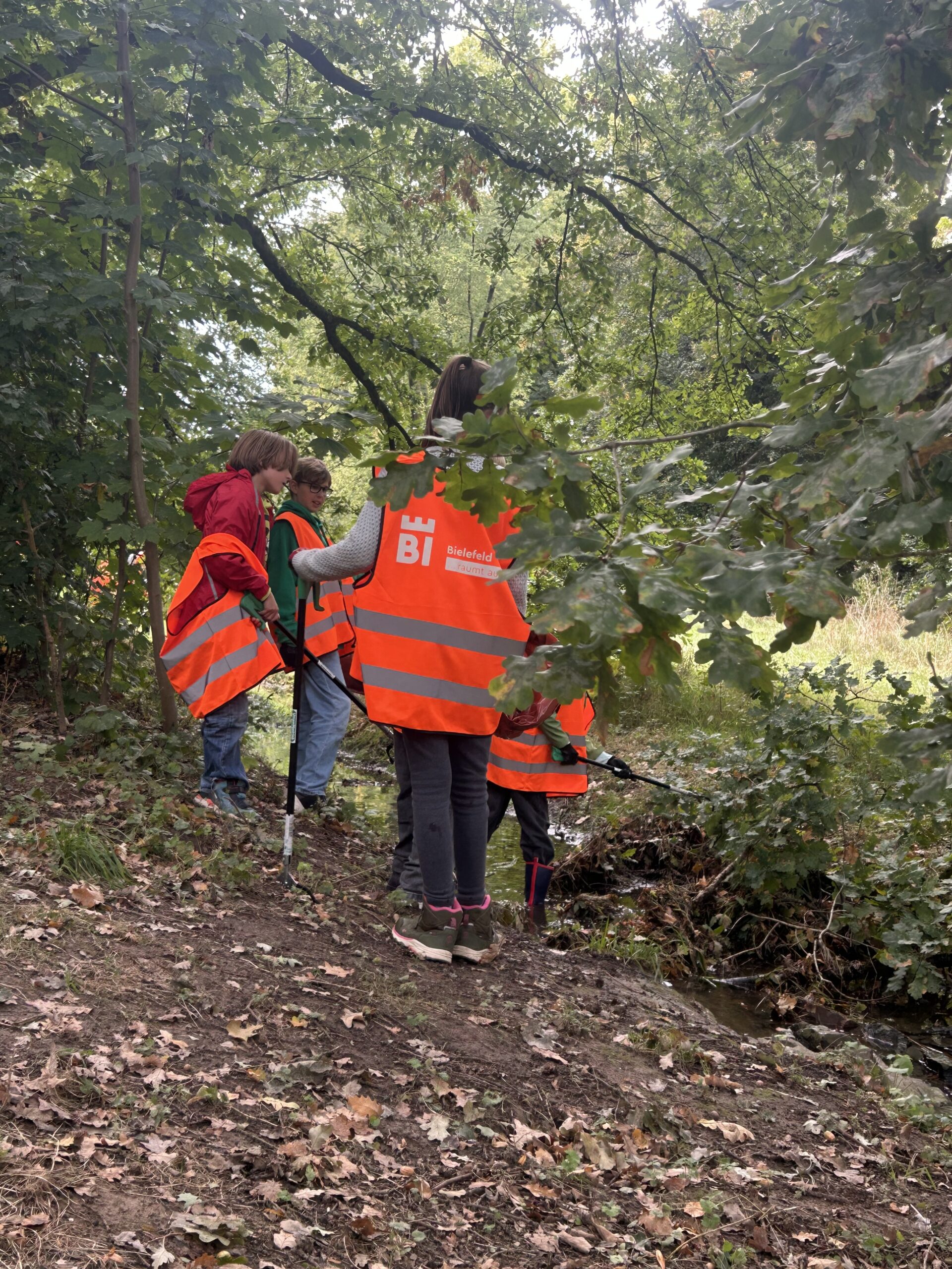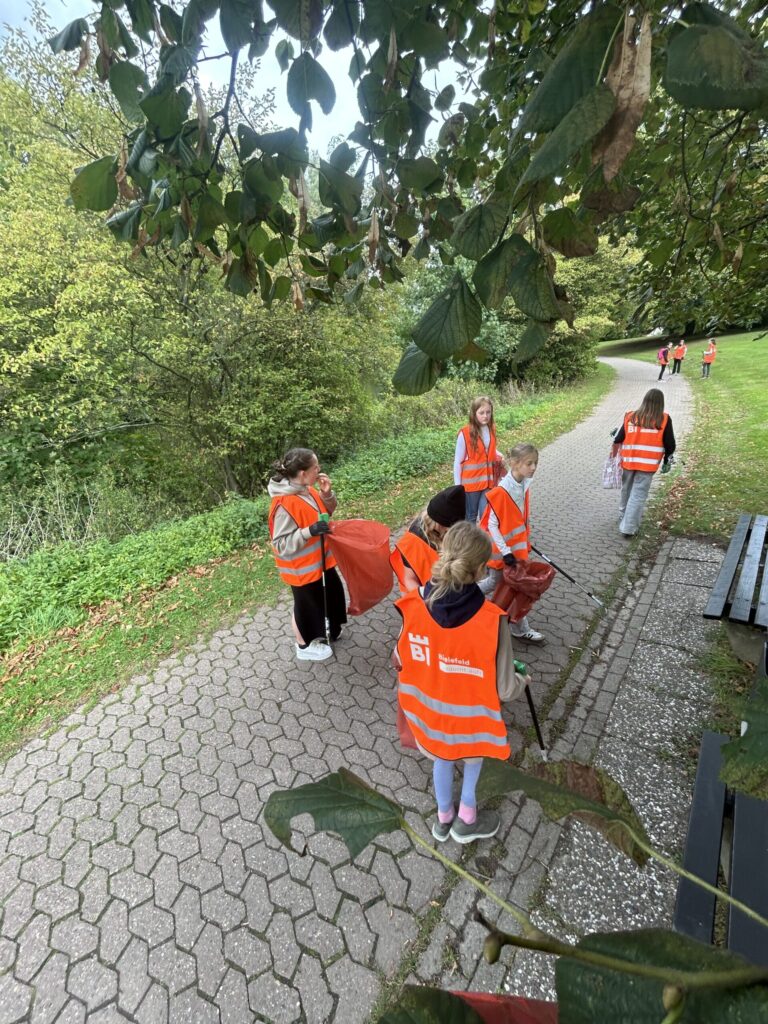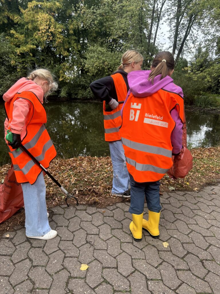 Mit gut sichtbaren orangenen Westen, roten Müllsäcken, sicheren Handschuhen, großen Greifern und jeder Menge Motivation ausgestattet, durchkämmten die Marienschülerinnen und -schüler mit Frau Kuhlmann und Herrn Brockhoff nicht nur die Park- und Uferbereiche, sondern suchten auch kleinere Bachläufe ab. Am Schultor gestartet, suchte die grellorangene Gruppe bereits ab der Sieboldstraße die Straßenseiten ab; spätestens ab dem Schildescher Park war allen klar, dass der Weg das Ziel ist.
