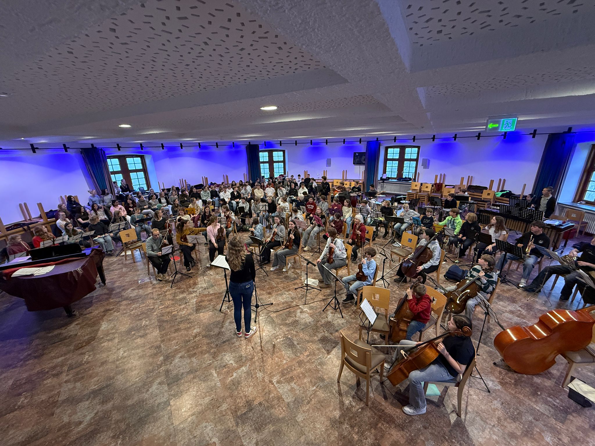 Am Freitagvormittag wurde dann das gemeinsame Stück „Hark, the Herald Angels sing“ mit allen Ensembles vor Ort geprobt und dabei kam schon vorweihnachtliche Stimmung auf. Da noch etwas Zeit war, bis die Busse kamen, spielten sich die Ensembles jeweils eins ihrer Stücke vor. Die Blockflöten unter der Leitung von Frau Mertens starteten mit „Tragt in die Welt nun ein Licht“ und „Jingle Bells“. Das Orchester, geleitet von Frau Möller“ spielte „German Carol Festival“, Der Chor 8-Q2, unter der Leitung von Frau Kober, sang „Run“ Und die Big Band spielte, geleitet von Herrn Möller, „A Chili Pepper Christmas“.